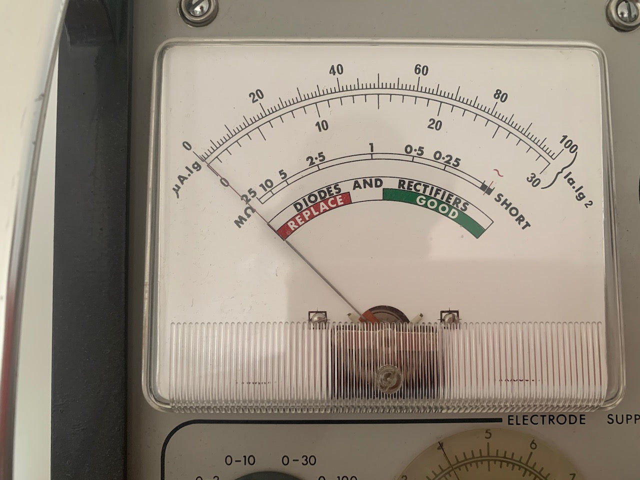 We test our rectifiers using a calibrated and standardised AVO VCM163 on the specified range. This VCM gives a qualitative estimation of emission as you can see from the photo, the GOOD range bar runs below the numerical uA/Ig scale with the GOOD range between 51 - 100. The above device test data, shows the max current range specified and a record of the numerical reading within the GOOD range obtained.