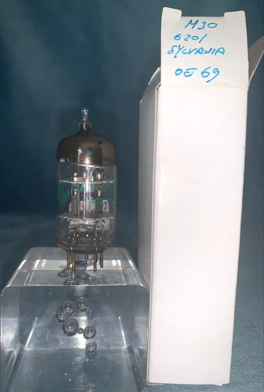 On offer today is a lovely SYLVANIA 6201 a premium quality ECC81 carrying the date code for October 1969. It tests as good using my AVO Valve Characteristic Meter VCM163