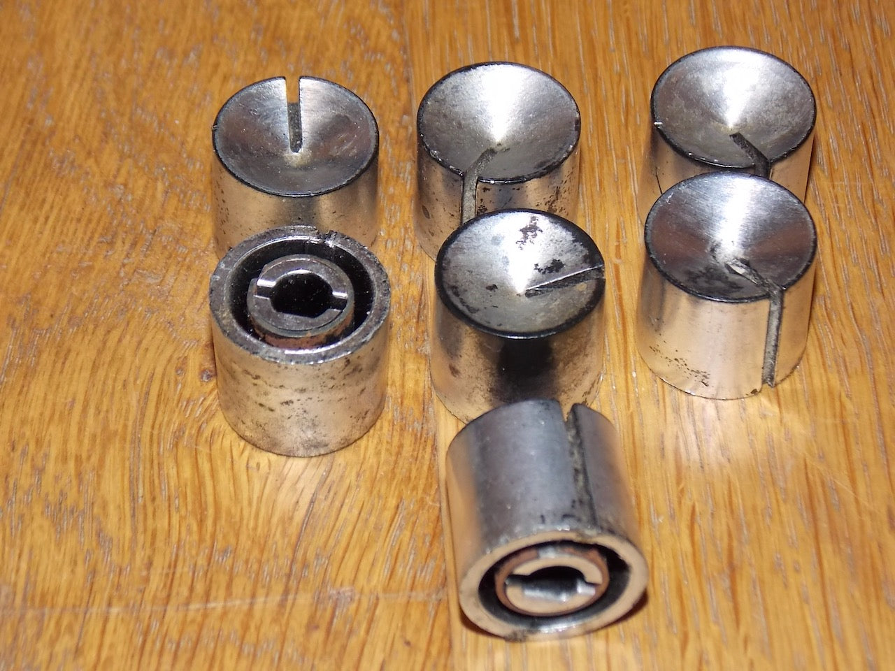 7X SILVER FINISH, DISHED TOP WITH MARKER, PRESS SWITCH KNOBS, 19mm DIA, 17mm HIGH, 6mm SHAFT, some slight finish loss as seen in photos