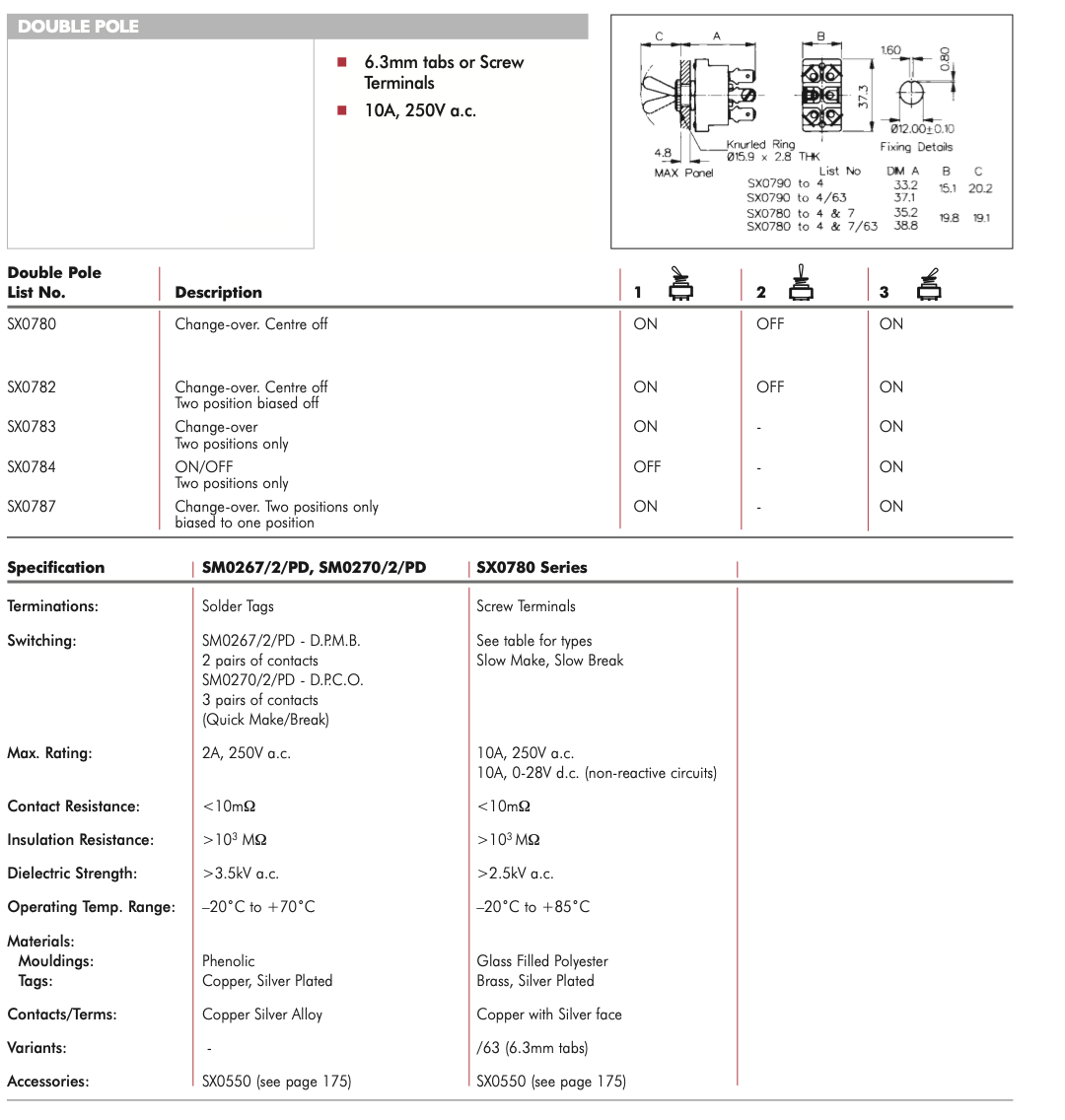 BULGIN, SX0782, NON LATCHING DPDT SWITCH, 10A @ 250VAC, WITH SILICON RUBBER BOOT, NX1030, NOS