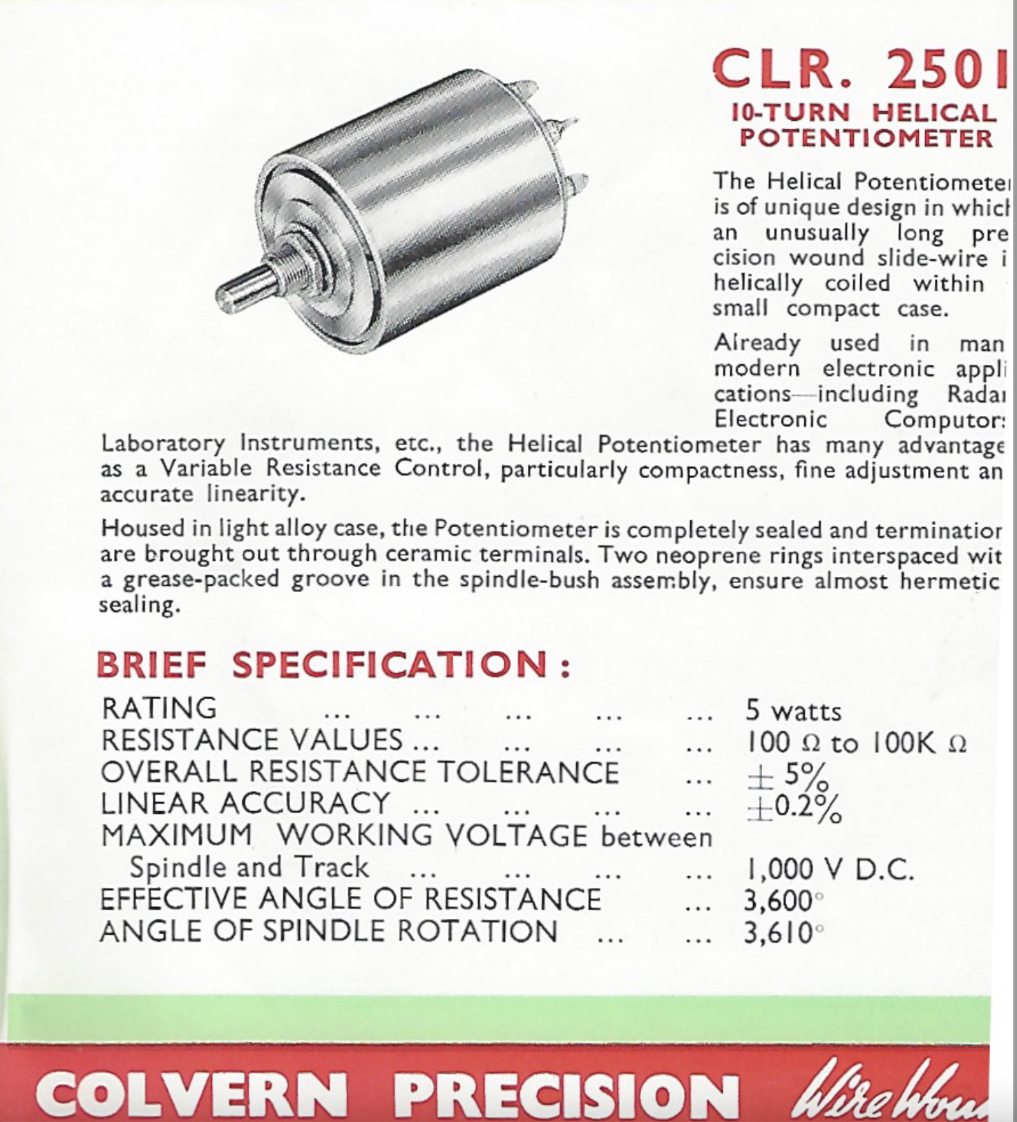 COLVERN, CLR.2503, 10 TURN HELICAL, WIRE WOUND POTENTIOMETERS, CASE SOLDER SEALED, MIL SPEC, EX EQUIPT, 5 OHM,