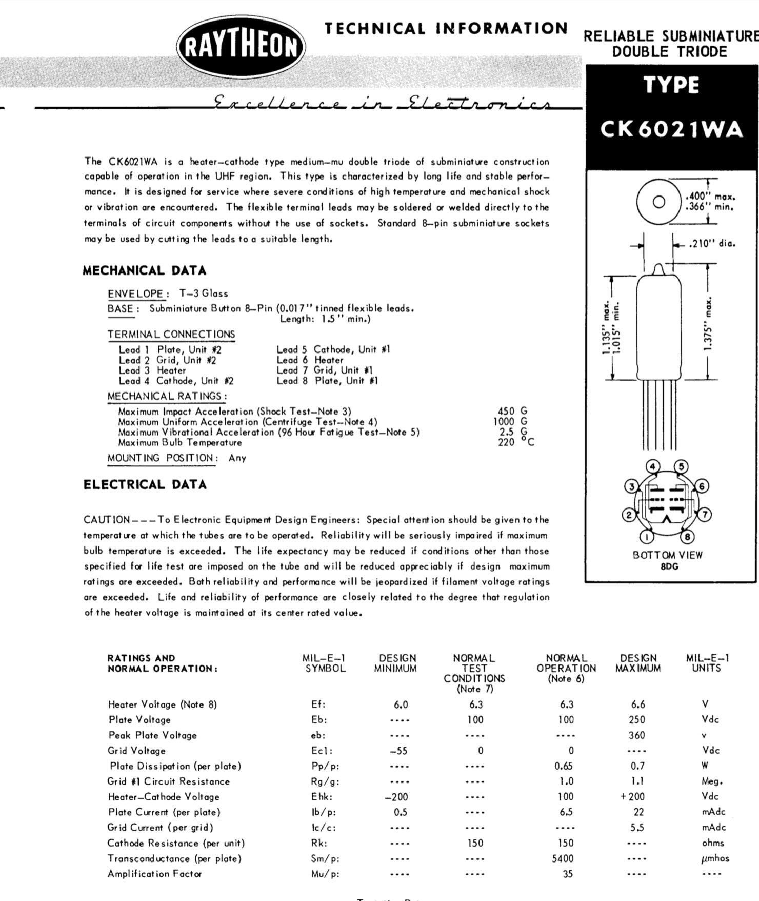 Philips 6021W is a low impedance medium mµ double triode and is a super sub miniature wire lead valve that was designed for the military.THE 6021W is shock and vibration resistant low impedance medium mµ double triode as was designed for use in avionics equipment to give reliable performance at altitudes of 60,000 feet. It is because of this valves excellent qualities it has found its way into modern effects pedals and compressors. The 6021W is the special quality version of the ECC70. This is Philips USA made in the original military boxes