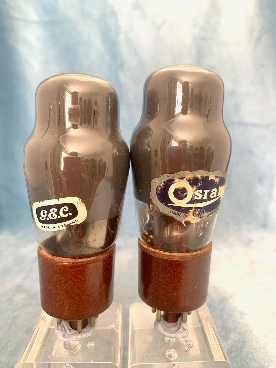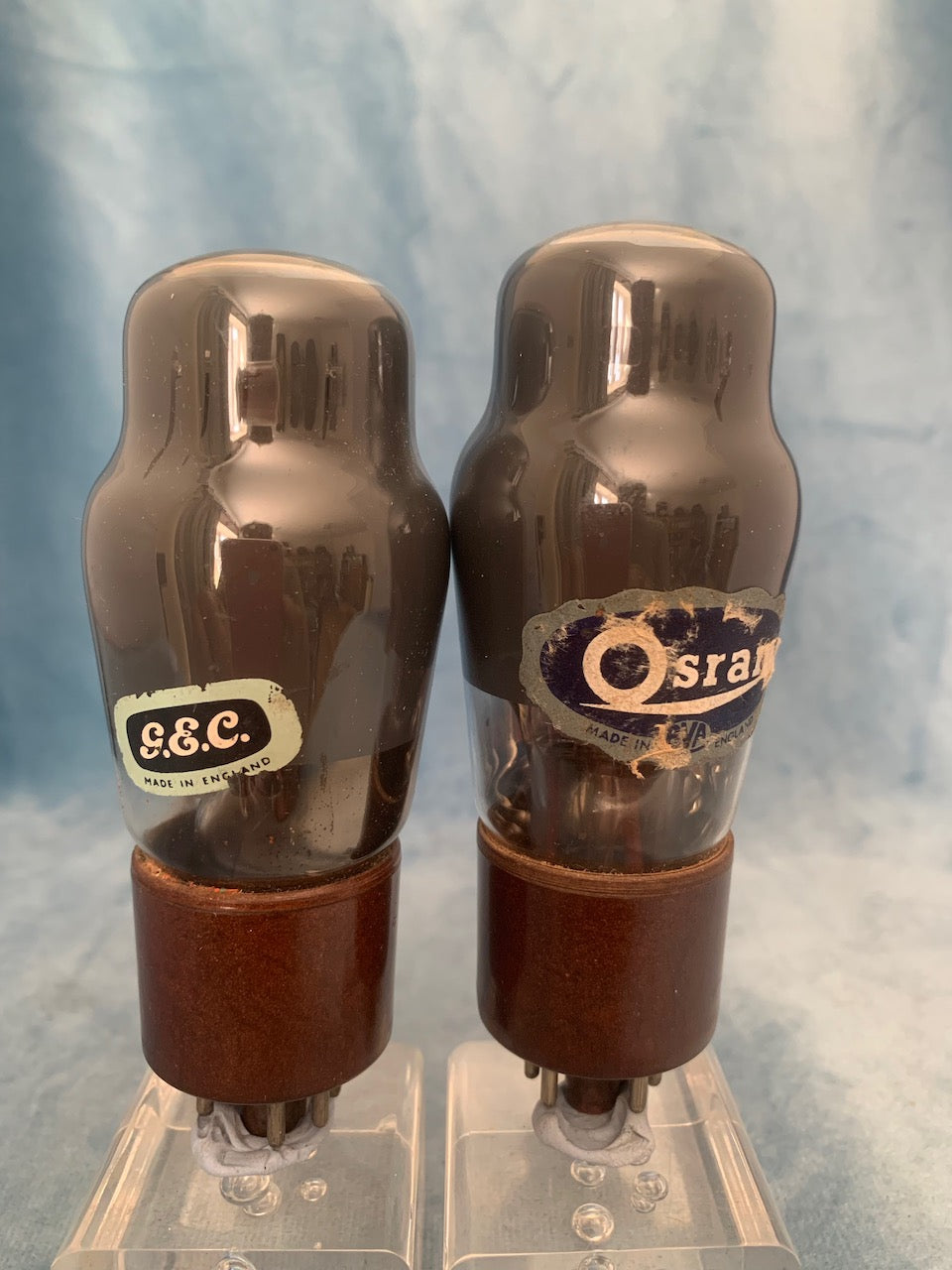 On offer today we have these beautiful Osram/GEC devices. They test showing good emission as you can see from the attached test data label courtesy of our AVO VCM163. The envelopes both carry the white inked cartouche and the brown micanol bases are tight to the envelopes with clean uncorroded pins.