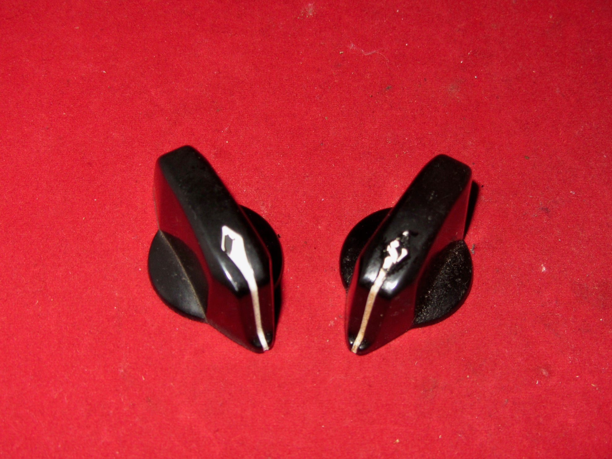 PAIR OF BLACK BAKELITE KNOBS, PEAK NOSED, WHITE INDEX, 25mm DIA, 42mm BAR LENGTH
