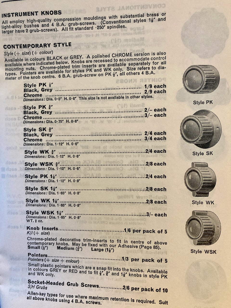 RADIOSPARES, RS, GREY KNOB, STYLE PK, AS USED ON KW ELECTRONICS, 29mm DIA, 6mm SHAFT, BRASS BUSHED