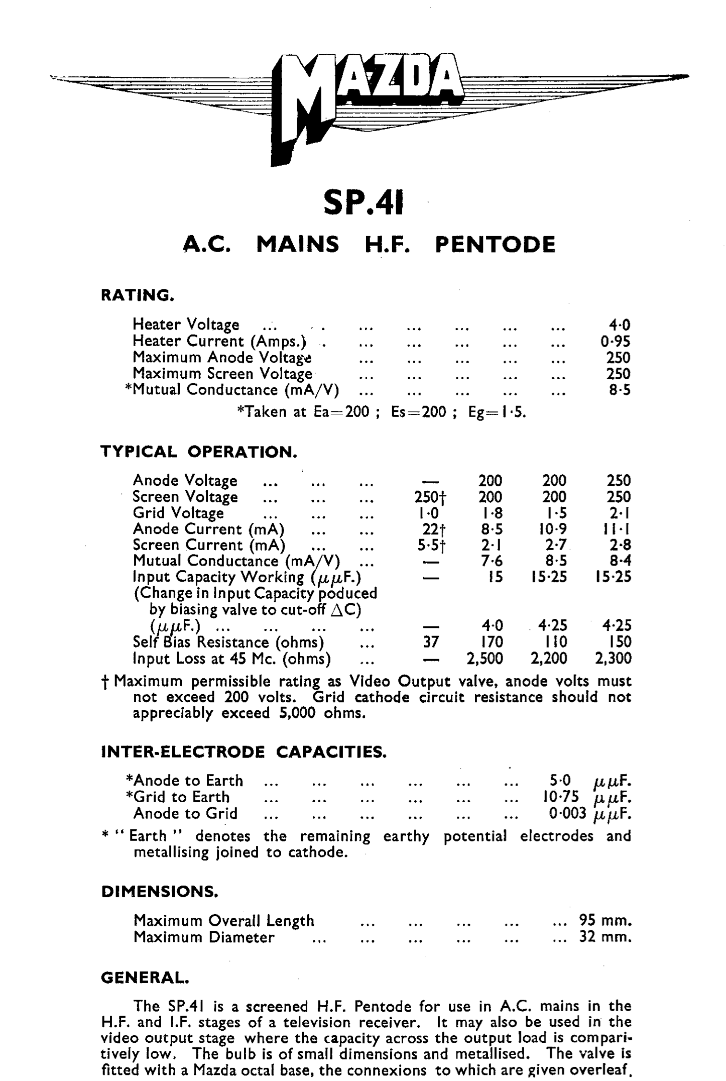 SP41, MAZDA, 5A/207D, ARP19, CV1335, CV1574, CV1699, CV1700, VR65A, NOS BOXED