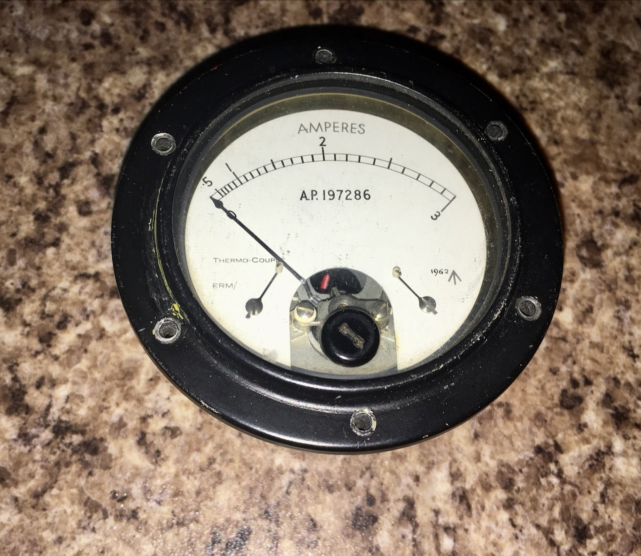 Thermocouple, Moving Coil Meter, AP197286, SCALED 0-3A, DATED 1962, 2.5 INS MOUNTING DIA., 3.25 INS OVERALL DIA Resistance across terminals 0R1. Sold on this basis with no returns