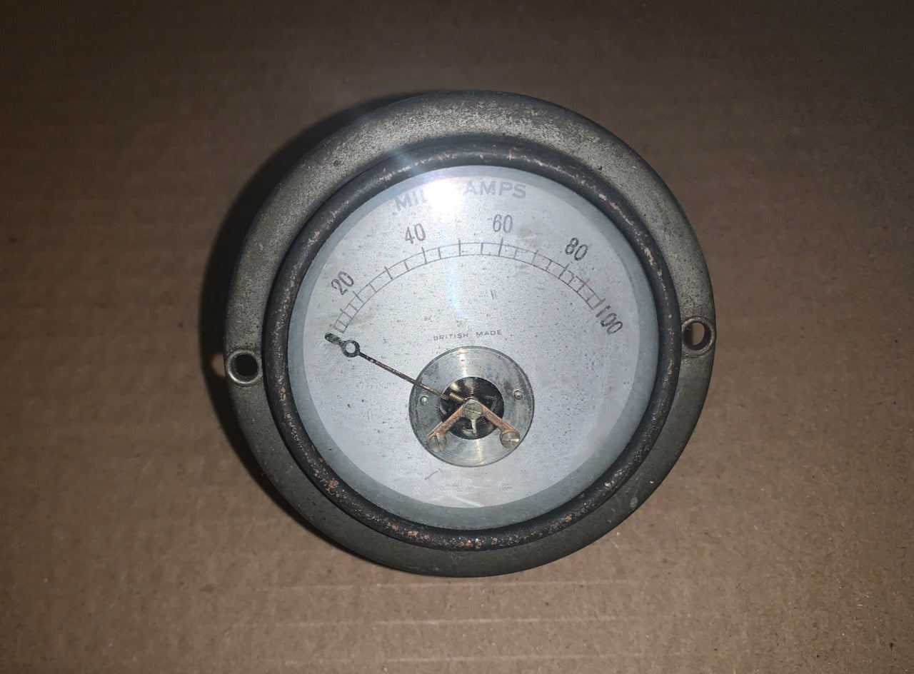 VINTAGE, NICKEL CASED, 73mm DIA.,MOVING COIL AMMETER, 0-100mA FSD, ENGLISH MADE